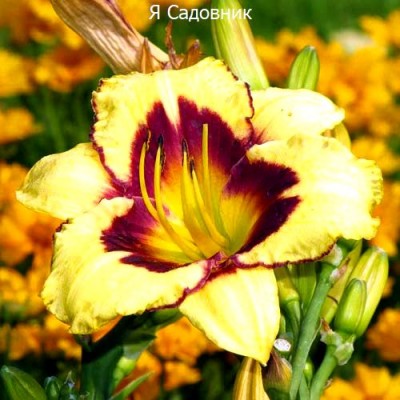 Бутоны раскрываются постепенно, обеспечивая длительное цветение, которое может длиться более месяца. Лепестки лилейника имеют насыщенный жёлтый цвет с фиолетовой каймой и основанием, а их края украшены лёгкой гофрировкой.